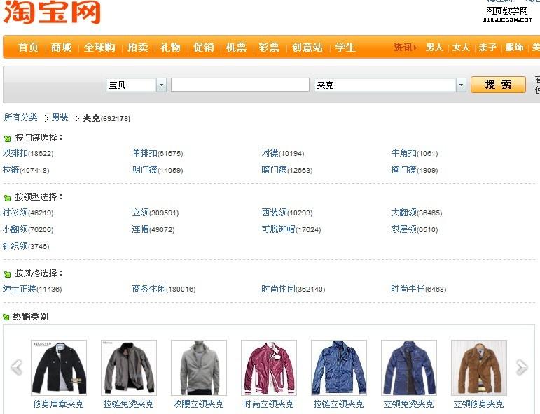 這下有不少人要抓狂了吧,請各位看官稍安勿躁,光發現問題還遠遠不夠,我們需要了解出現問題的源頭,為什么淘寶網要這么做?大家都知道以前的“淘寶店鋪優化寶典”里有一條就是利用“寶貝標題當中的n多關鍵字”結合“商品搜索排名規則”來獲取免費流量,這招確實很管用,你大概也詫異過某些商品的標題里甚至加了一些根本不找邊際的關鍵詞吧,在以前那樣都行。現在卻不行了,如果你再細心點,會發現淘寶的搜索頁面也有些許變化,我依次從“我要買-男裝-夾克”點進去,就到了這個頭部充滿精確篩選條件的頁面(圖3)。關鍵的是這些篩選條件就是淘寶網商品發布系統的“商品屬性選項”,我猜想重要的屬性參數是影響你的寶貝是否會被下架的條件,比如“門禁、領型、風格”,而次要屬性參數暫時不會影響你的寶貝是否會被下架,比如“尺碼、板型、設計元素、面料”。就是你的商品標題如果和這些次要屬性參數相沖突也不要緊,不會被下架。