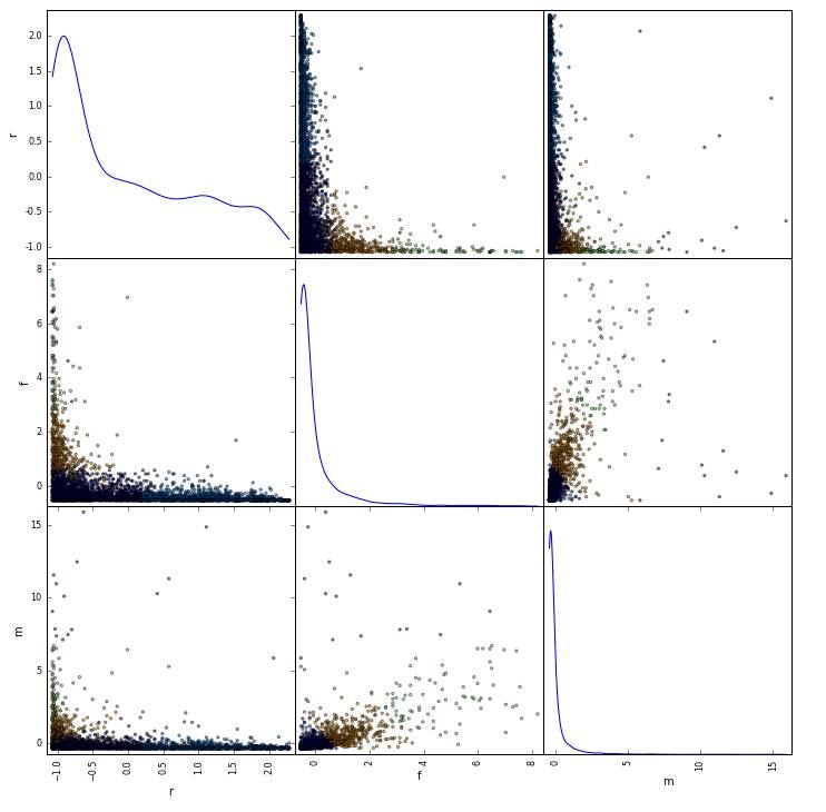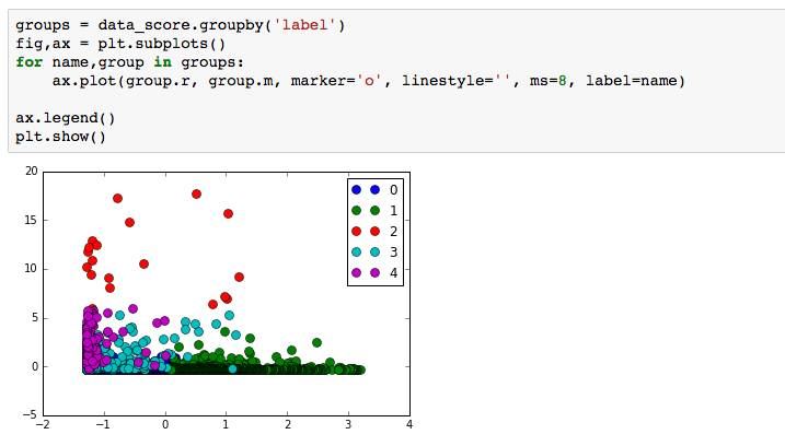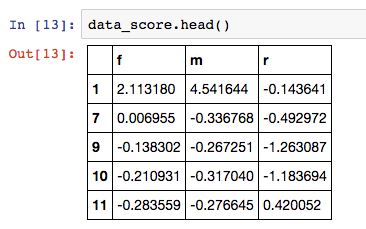 上圖的三列數(shù)據(jù)是經(jīng)過標準化后的用戶消費數(shù)據(jù)。值越接近0,說明離平均水平越近。r值因為是最近一次消費時間,所以值越小,說明時間越接近,值越大,說明消費越久遠。