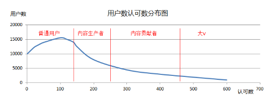 以問答社區為例,主要KPI是內容數量和質量,體現在用戶所貢獻內容獲取的認可數上,通過數據收集整理得出用戶認可數分布如下,我們以用戶認可數為指標建立用戶分層。