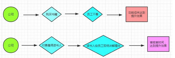 公司可以指定一些書籍,然后讀書人來看,先去進(jìn)行知識(shí)消化,整理,然后利用一個(gè)固定的時(shí)間,由讀書人來給員工講,直接將書籍的要點(diǎn),精華通過生動(dòng)直觀的語言分享給員工。公司給讀書人報(bào)酬。