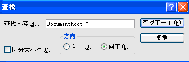 2、雙擊打開httpd.conf這個文本文檔,然后同時按下鍵盤上的Ctrl+F組合鍵查找“DocumentRoot "”(帶英文雙引號",見圖2),查找出來之后(僅有一處),將字符串“DocumentRoot”后面雙引號內(nèi)的字符串修改為自己想要設(shè)定的網(wǎng)站目錄。