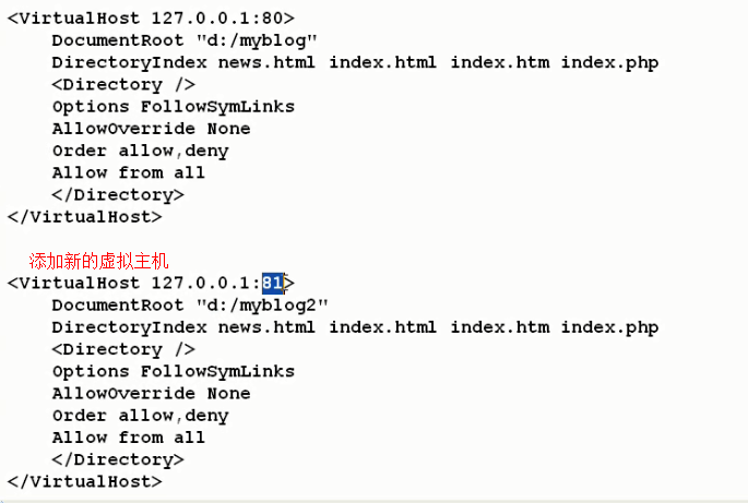 2. 配置httpd.conf文件(存放在apache安裝目錄的conf文件夾中),添加新的虛擬主機