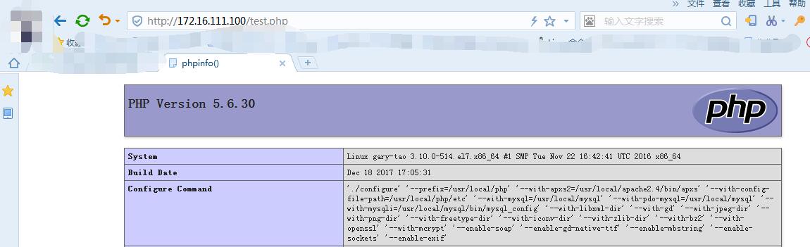 驗證:用瀏覽器打開網址:172.16.110.100/test.php 會在瀏覽器中顯示php的信息。