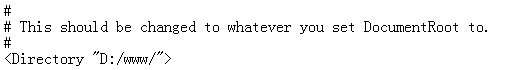 找到上圖所在位置,修改DocumentRoot后的文本,用來配置一個網站的根目錄,此處配置是為了告訴Apache你的網站根目錄在什么地方。比如我就將根目錄配置到了D盤的 www文件夾下。