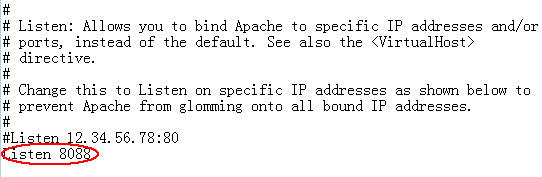左鍵托盤圖標,在“Apache”里可以直接打開httpd.conf,查找到“Listen 80”,可以改成其他端口,我選用8088。