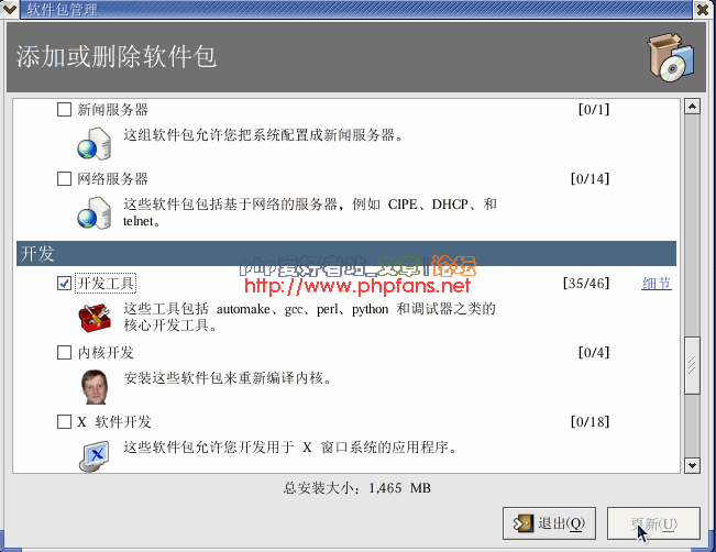 2. 如果gcc還沒有安裝的話,開發工具前面的勾是沒有勾上的.勾上開發工具.點擊右下角的 更新.如圖