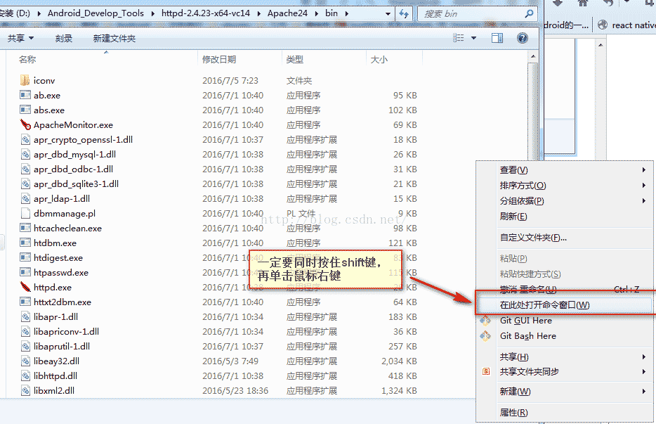 4、進入到bin目錄下,然后按住shift按鍵不放單擊鼠標的右鍵,選擇 “在此處打開命令窗口”