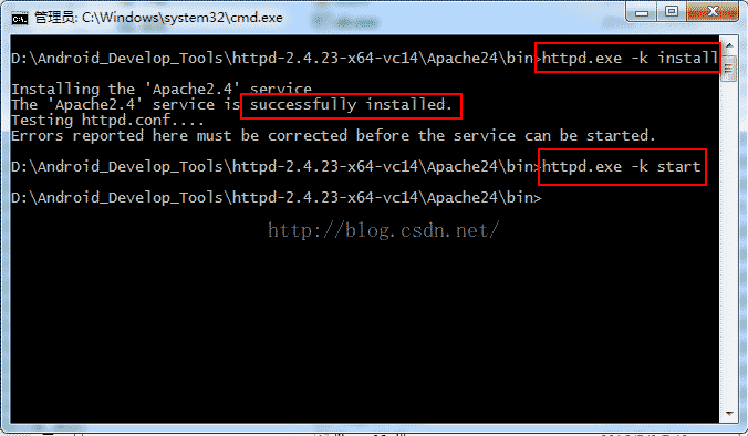 然后輸入 httpd.exe -k install 按住Apache服務,看到這些新系統就說明安裝成功了