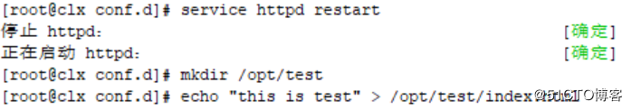 之后重啟httpd服務,在opt目錄下創建一個test目錄在這個目錄下寫入一段語句