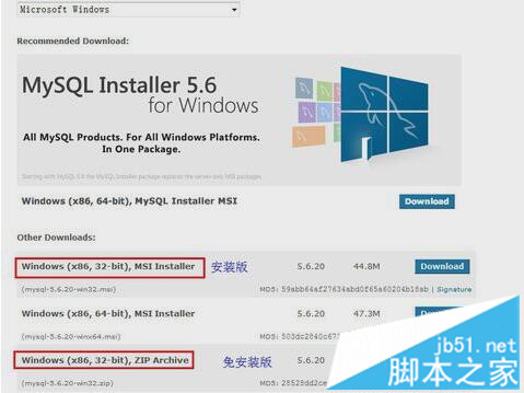 MySQL5.6.20(mysql-5.6.20-win32.zip),網址:http://dev.mysql.com/downloads/mysql/,此處選擇的為免安裝版,參看下圖