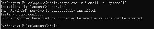 第五步,輸入命令安裝運行命令,也可以通過 httpd.exe -k uninstall -n "Apache24" 來卸載運行命令,如下圖所示