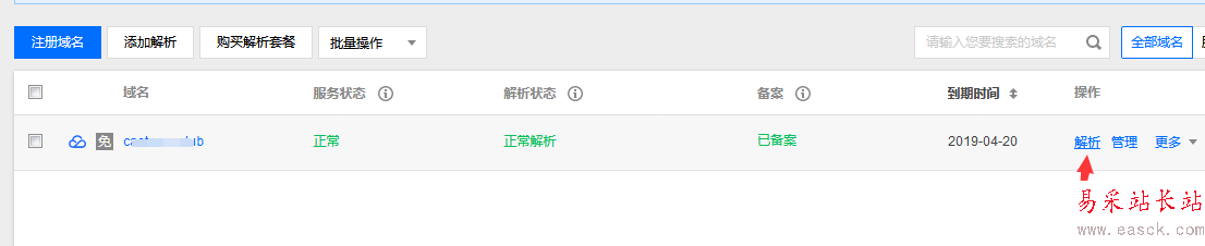 接下來我們需要登錄所購域名運營商的域名管理后臺,點擊‘域名解析':