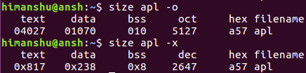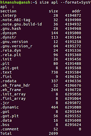 size 的基本用法很簡單。你只需要將目標文件/可執行文件名稱作為輸入就行了。下面是一個例子: