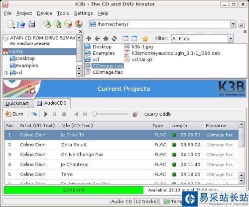 對于刻錄那些帶有cue文件的flac或ape文件,可以使用k3b的monkey audio插件(k3b的官方網站有下載源程序),可以簡單地播放和刻錄帶cue指定分割的flac或ape文件。ape插件在ubuntu的源里面沒有找到,只能自己去官方網站下載。安裝完以后,就可以通過直接雙擊cue文件來打開ape/flac文件了。打開之后,k3b會自動地根據cue列出一個cd的音軌列表,把音頻進行分割。