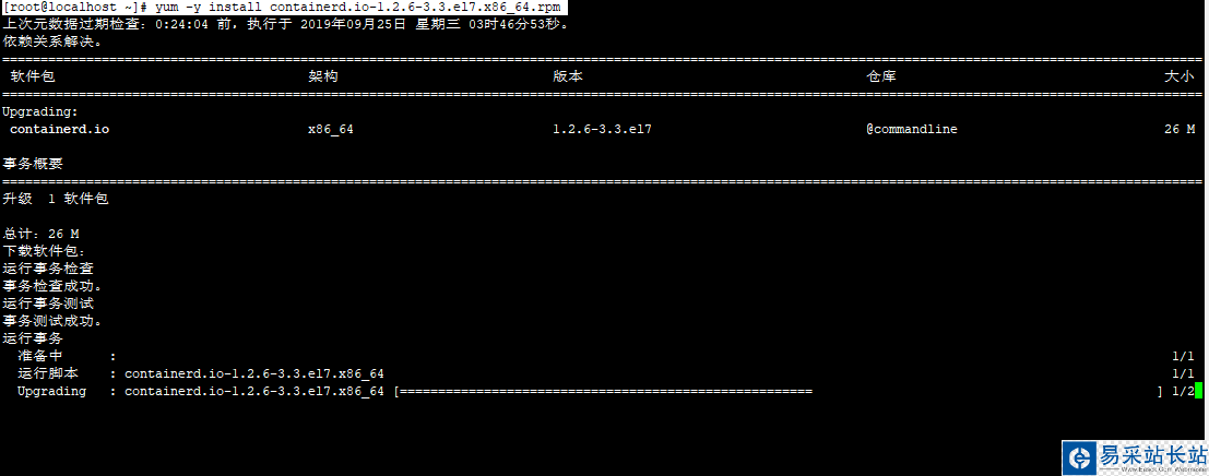 [root@localhost ~]# yum -y install containerd.io-1.2.6-3.3.el7.x86_64.rpm //升級containerd.io軟件包