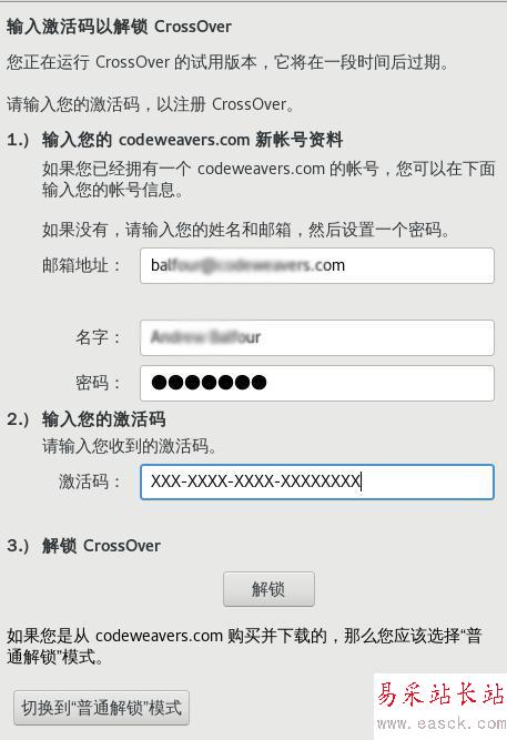 步驟2:如果您得到的是一個激活碼,在通過以上步驟打開注冊窗口后,點擊“輸入激活碼…”按鈕并在彈出的對話框里填寫好資料,之后它會為您創建一codeweavers.com 賬戶,您所使用的激活碼也會被綁定到您的賬戶。除此之外,您也可以在 這個頁面上將您的激活代碼和賬戶進行綁定。