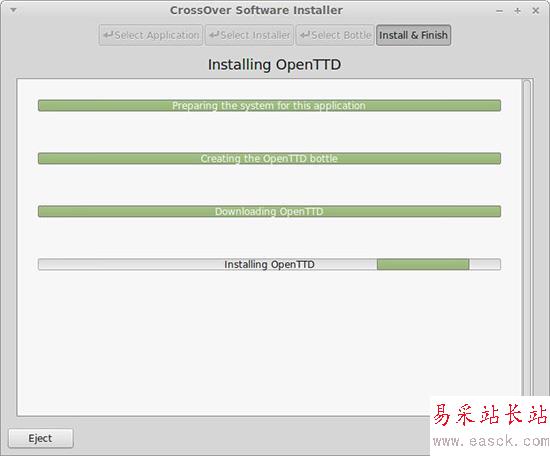 6)接下來點擊右下角的繼續安裝按鈕。CrossOver將首先創建一個容器來存儲Windows應用程序的文件,然后嘗試運行程序的安裝程序。