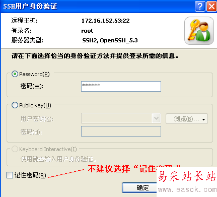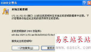 按上圖提示輸入相應內容后,點擊“確定”。返回到上一菜單中,找到我們剛建立的連接“my-linux”,點擊“連接”,在第一次連接“陌生”的LINUX服務器時,會出現如下警告: