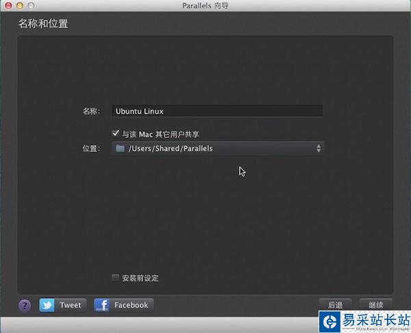 4、設定安裝的linux的用戶名和密碼,密碼需8位以上。點擊“繼續”進入下一步。設定虛擬機的名稱及位置,若要安裝多臺虛擬機,可設定“與該Mac其他用戶共享”。勾選“安裝前設定”可配置虛擬機的各種參數(安裝完可修改設定),也可以使用默認配置。