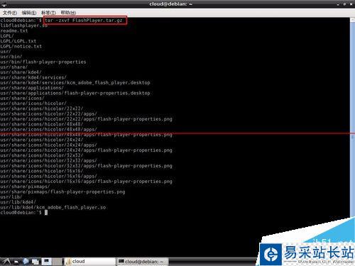 4、接下來解壓文件包,打開終端,輸入命令:"tar -zxvf FlashPlayer.tar.gz",解壓完成后會得到:"libflashplayer.so"文件,這就是Flash插件。