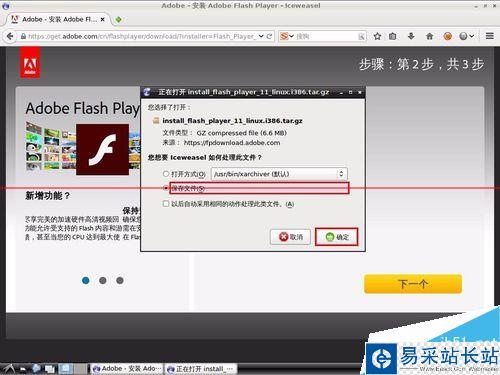 3、在彈出的對話框中,選擇:"保存文件",然后點:"確定"。保存文件名為:"FlashPlayer.tar.gz",保存到用戶目錄下,等待下載完成。