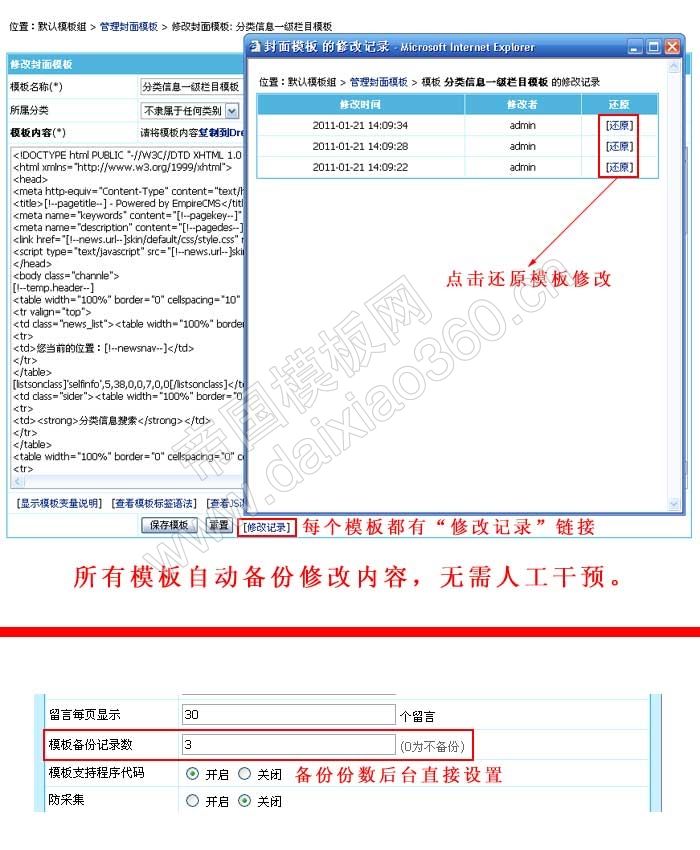 新增模板自動備份功能,可隨時還原備份,修改模板無后顧之憂,更人性化。(1)、所有模板都支持自動備份:包括標簽模板、JS模板、列表模板、內容模板、搜索模板、模板變量、封面模板、首頁方案、自定義頁面模板、評論模板、打印模板、投票模板、所有公共模板等都支持模板自動備份。(2)、可設置備份模板份數,默認為3份;(3)、可以將模板還原至任意備份記錄。 上傳以下圖片: