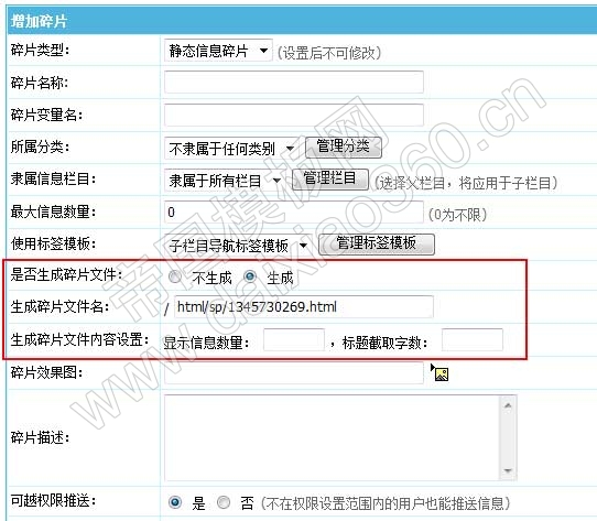 帝國CMS7.0對碎片功能進行升級,使用更方便實用,新增如下特性:1、碎片調用支持生成html頁面,外部引用更方便:在原來支持標簽調用的基礎上,還新增了生成碎片html頁面功能,方便在模板中直接引用文件與外部程序引用,調用更多樣化。2、碎片功能新增批量導入信息功能,可以將查詢的信息批量加入碎片,更方便。3、新增“靈動標簽式”調用碎片信息功能,調用信息超級方便。上傳以下圖片: