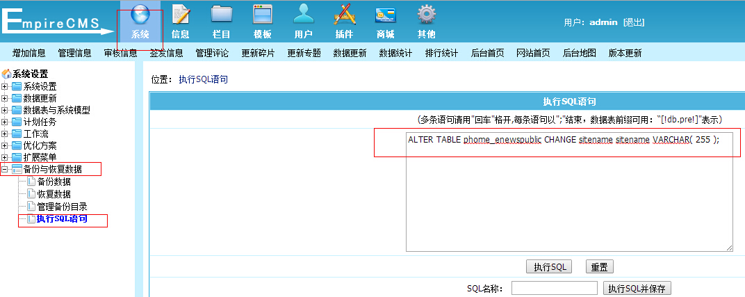 登陸后臺 系統 備份與恢復數據 執行SQL語句 執行下面的語句