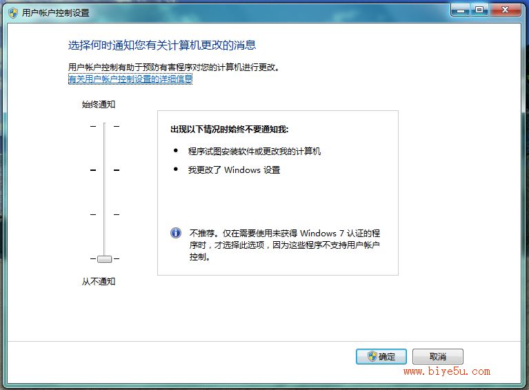 UAC,用戶帳戶控制設置如下,這個設置主要是避免Windows7種由于用戶帳戶權限控制使得有些功能不能正確安裝。