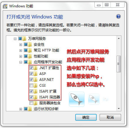 然后點開“萬維網服務”,點開應用程序開發功能,依次選中:.NET擴展性、ASP、ASP.NET、ISAPI擴展、ISAPI篩選器,如果想安裝PHP,需要將CGI也選中。