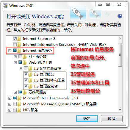 (2)選取“打開或關閉Windows功能”后,就會打開Windows功能窗口,找到“Internet信息服務”,將Internet信息服務前面的加號點開,找到“web管理工具”,選中“IIS管理服務”、“IIS管理腳本和工具”、“IIS管理控制臺”。