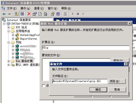 2. 新增一個(gè)服務(wù)擴(kuò)展,路徑為 "%windir%/System32/inetsrv/gzip.dll"。添加完成后,允許該擴(kuò)展使用。
