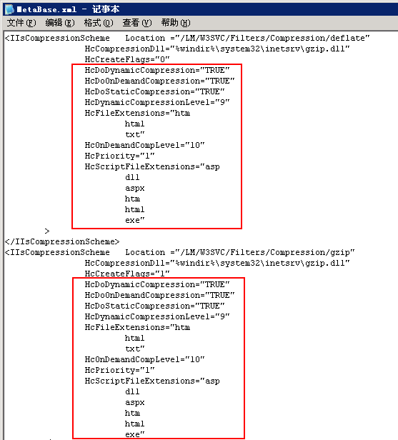 4.用記事本打開 "%windir%/system32/inetsrv/MetaBase.xml",找到 "IIsCompressionScheme",按下述方法修改、保存。(建議修改前先做備份)