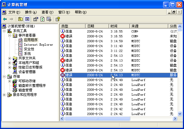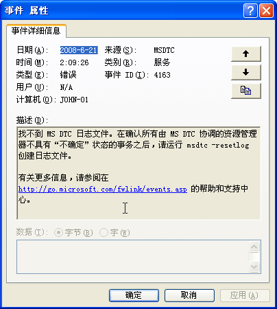 在計算機管理點事件查看器中的應用程序,如果你發現MSDTC錯誤的話,嘿嘿,也許你就不用象我這么麻煩了,其實要是我在重新安裝IIS之前看一眼的話,我也不用麻煩了……怪我水平高精尖的不算!雙擊錯誤提示,打開對話框: