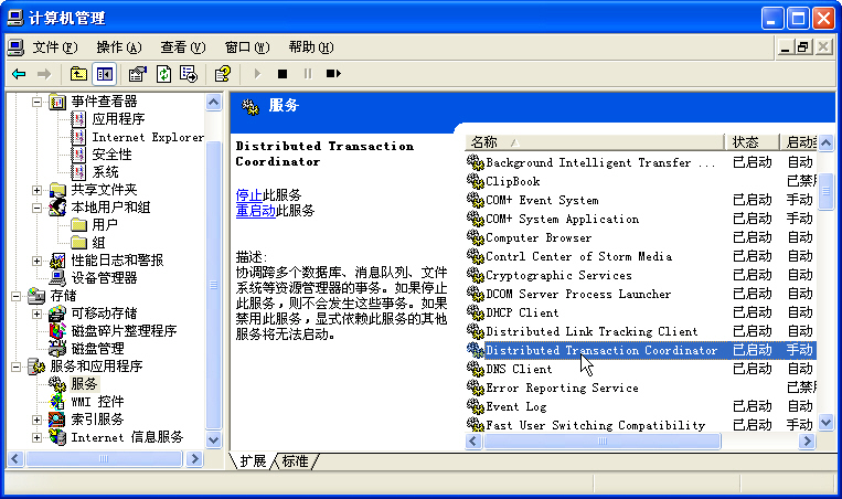 在計算機管理點服務和應用程序中的服務,右側就出現計算機的服務列表,出問題時你找不到“distributed transaction coordinator”這項服務的,嘿嘿,這是我啟動MSDTC后才出現的服務,它的主要作用大家可以看上圖中的描述部分,如何啟動它,別急,先讓我解決我的問題才說。