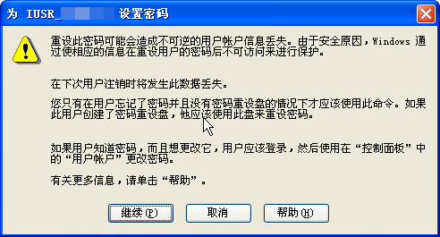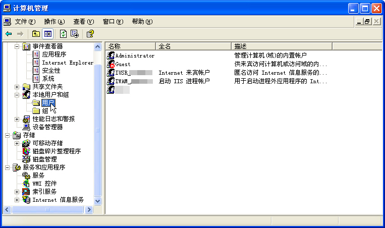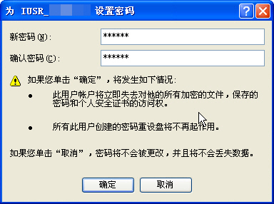 在計算機管理點本地用戶和組中的用戶,右側出現系統的用戶列表,不好意思,我把我的用戶名字馬賽克了,我們要給IUSR_機器名和IWAM_機器名兩個用戶改密碼,記得改成一樣的密碼。右鍵單擊IUSR_機器名,菜單第一項就是更改密碼,點擊后: