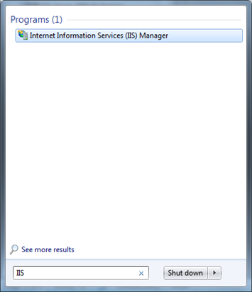 在開始 ->查找框中輸入IIS,找到Internet Information Services (IIS) Manager。