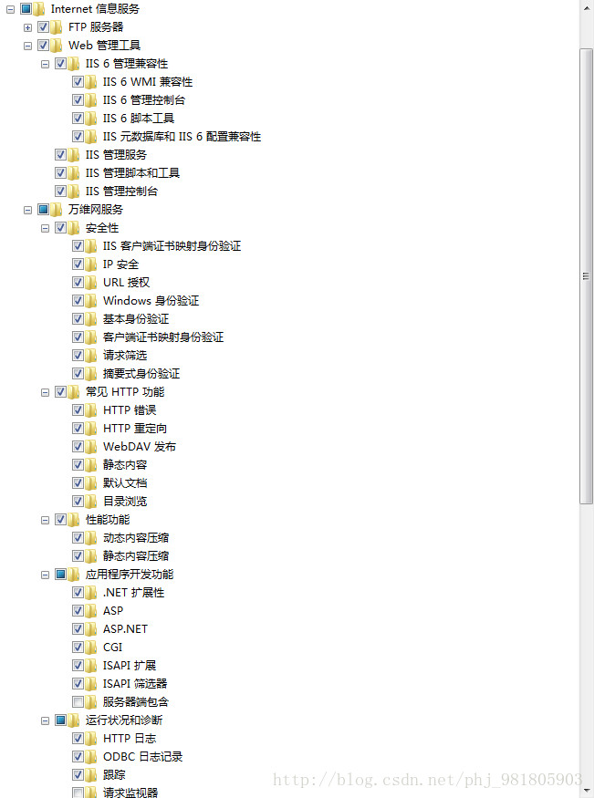 2、選擇Internet信息服務(wù),選擇需要的功能。單擊確定按鈕,等待系統(tǒng)配置。如圖所示: