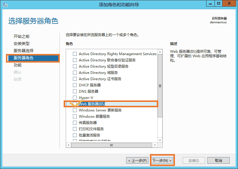 這里角色列表內找到"Web服務器(IIS)",單擊勾選它;
