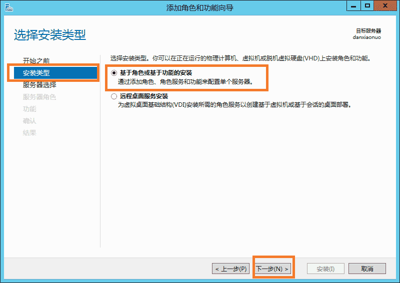 點擊左邊"安裝類型",然后單擊"基于角色或基于功能的安裝",再單擊"下一步(N)";