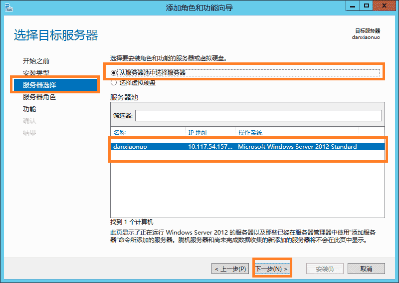 先單擊"從服務器池中選擇服務器",再單擊"本服務器的計算機名",這個ip上只有本機,所以直接單擊"下一步(N)";