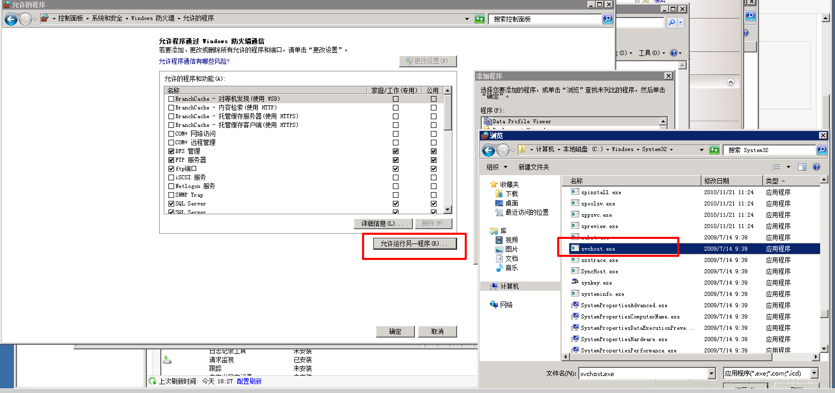 在防火墻界面,點(diǎn)擊“允許應(yīng)用或者功能通過(guò)Windows防火墻”―->允許其他應(yīng)用―->瀏覽―->選擇 C:/Windows/System32/svchost.exe>―-打開(kāi)