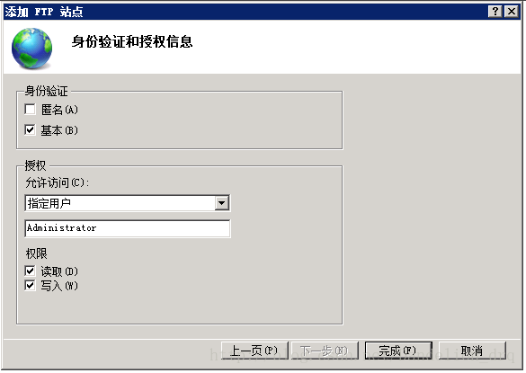 身份認(rèn)證選基本,用戶則建議添加一個(gè)專門(mén)用來(lái)登錄ftp的用戶,然后指定給這個(gè)用戶授權(quán)