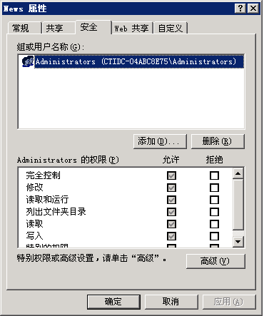 之后,我們開始給WEB文件夾賦予權限了.順便提一下,給WEB文件夾配置權限這個步驟很重要,見過很多站點被黑都是因為文件夾權限設置不當,要么過大,要么根本沒有一站一用戶,有些站點直接給EveryOne用戶最大權限,甚至有些站長認為NTFS磁盤格式"根本沒用",直接把網站所在的磁盤做成 FAT32的,還有很多的虛擬主機商為了圖省事,雖然做到了一站一戶(軟件生成),但是配置的權限過高,因為配置低權限有時候會出現運行故障....后果可想而知.我們遇到問題不要慌,特別是安全的問題.
