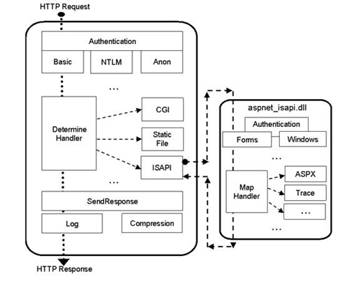在IIS7之前,ASP.NET 是以 IIS ISAPI extension 的方式外加到 IIS,其實包括 ASP 以及 PHP,也都以相同的方式配置(PHP 在 IIS 采用了兩種配置方式,除了 IIS ISAPI extension 的方式,也包括了 CGI 的方式,系統管理者能選擇 PHP 程序的執行方式),因此客戶端對 IIS 的 HTTP 請求會先經由 IIS 處理,然后 IIS 根據要求的內容類型,如果是 HTML 靜態網頁就由 IIS 自行處理,如果不是,就根據要求的內容類型,分派給各自的 IIS ISAPI extension;如果要求的內容類型是 ASP.NET,就分派給負責處理 ASP.NET 的 IIS ISAPI extension,也就是 aspnet_isapi.dll。下圖是這個架構的示意圖。