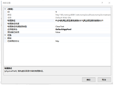 3、點擊右側的高級設置,進入如下的界面,配置物理路徑為ASP源程序的保存目錄,確定后退出。