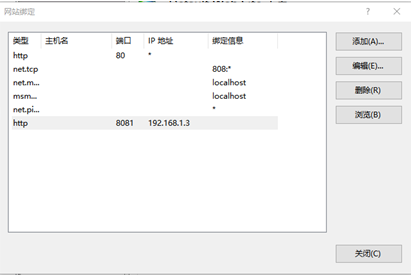 4、點擊綁定,進入如下界面,配置端口號為80或8081,配置IP地址為本機地址(或服務器地址),關閉。