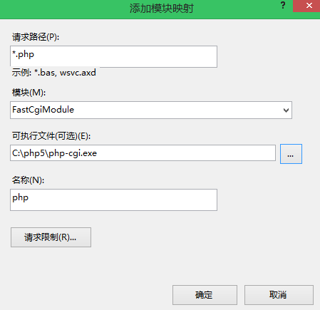 4、在請(qǐng)求路徑輸入”*.php”,模塊選擇FastCgiModule模式,可執(zhí)行文件時(shí),文件格式可以選擇exe程序和選擇路徑:C:/php5/php-cgi.exe,名稱比如php,最后確定添加模塊映射。